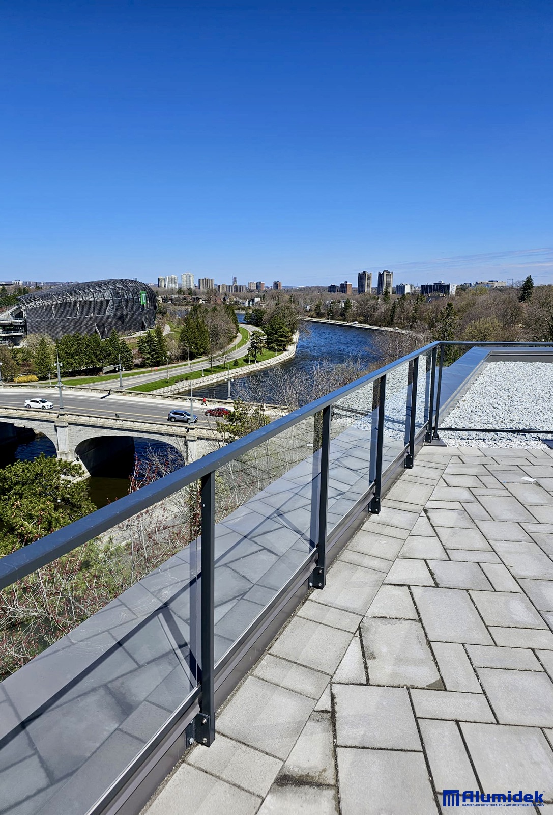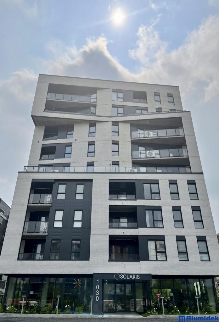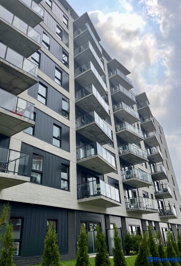 Le projet Solaris, situé à Boisbriand et conçu par la firme Formes Studio Architectes, regroupe 133 unités locatives au design moderne et lumineux. Pour ce développement, Alumidek a contribué à la signature architecturale du bâtiment avec le système V150 pour les garde-corps de balcons, le V150M pour les terrasses, ainsi que le modèle S-01 pour la séparation des logements au rez-de-chaussée, alliant durabilité, élégance et fonctionnalité.