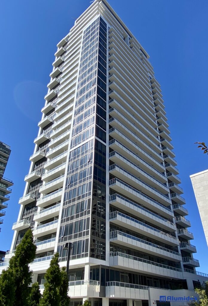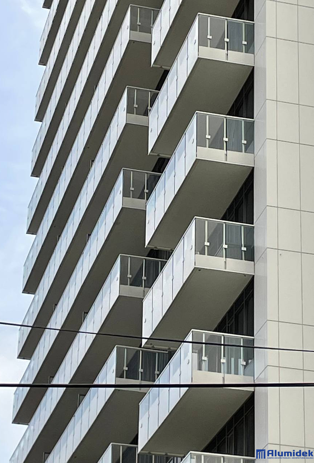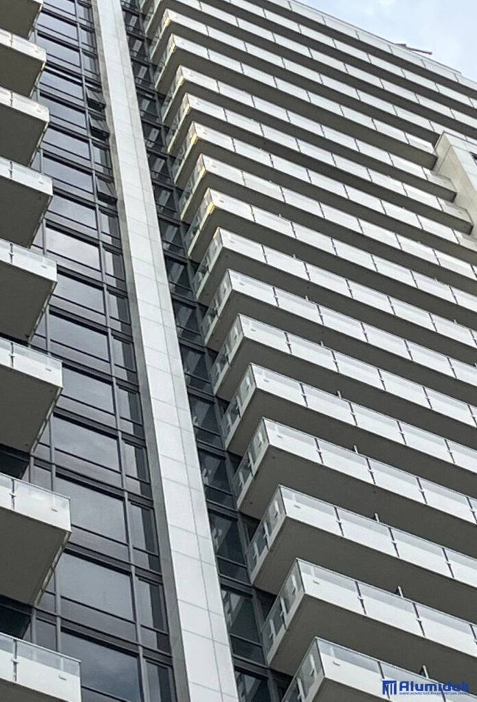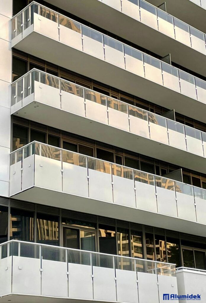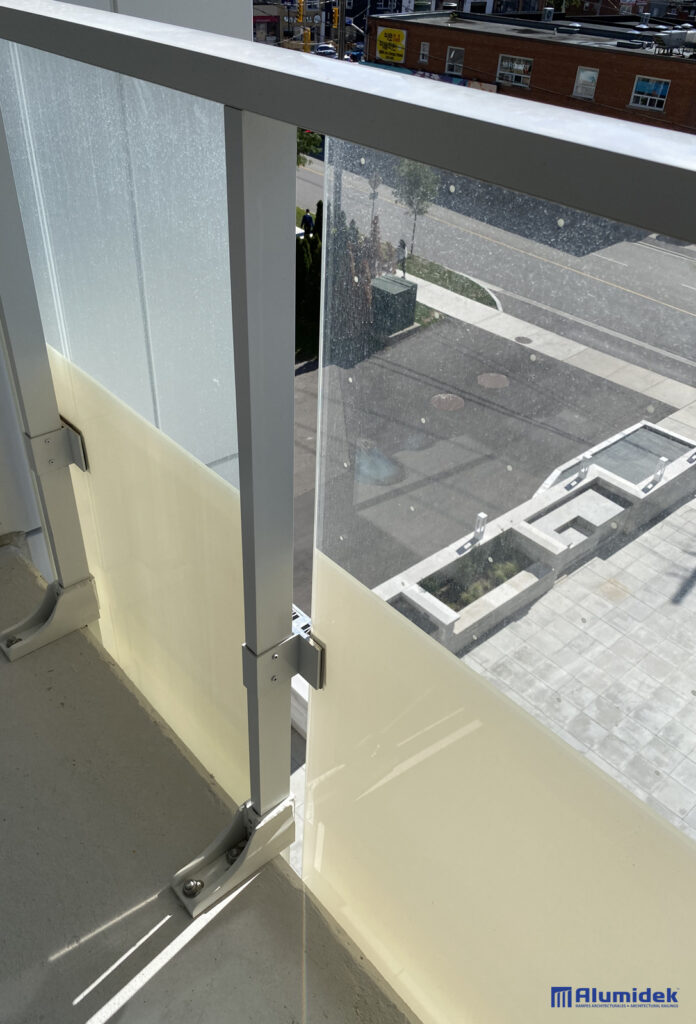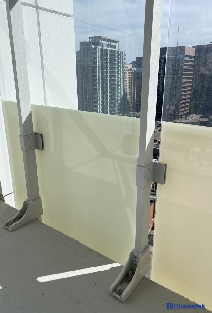 Pour cette réalisation, Alumidek a fourni des garde-corps V225 adaptés aux exigences du design, incluant une main courante plus volumineuse pour une présence visuelle accrue et un meilleur confort. Les panneaux en verre laminé ultraclair comportent un motif en CeraFrit conforme aux normes bird-friendly de Toronto. Des attaches structurelles ont été ajoutées entre les panneaux pour améliorer la rigidité globale et assurer une performance optimale en hauteur.
