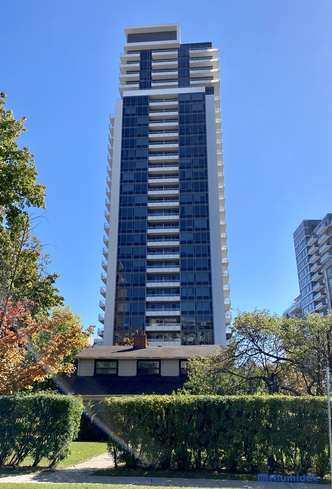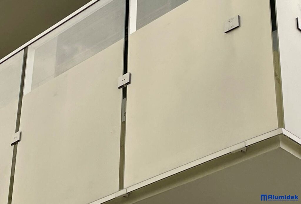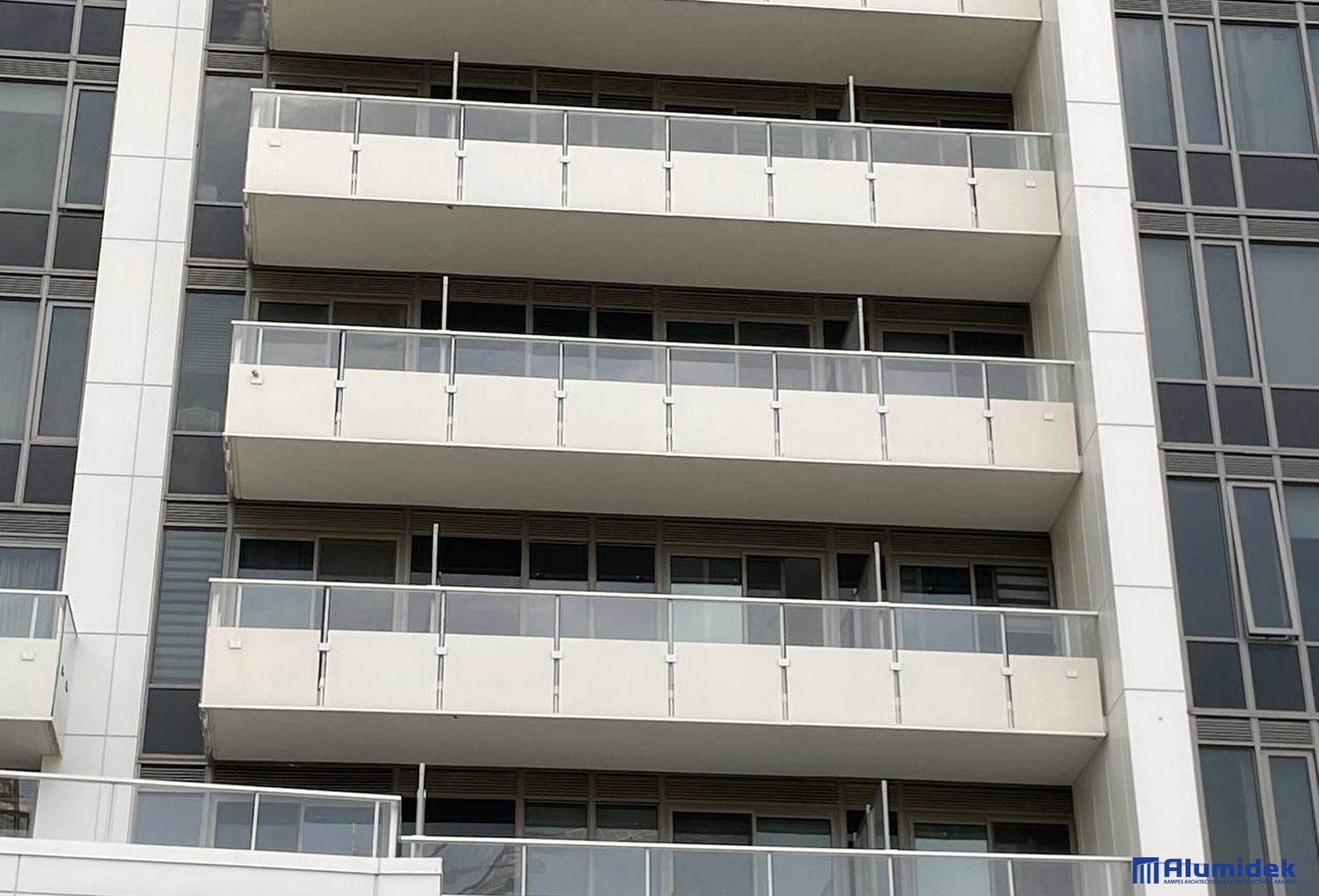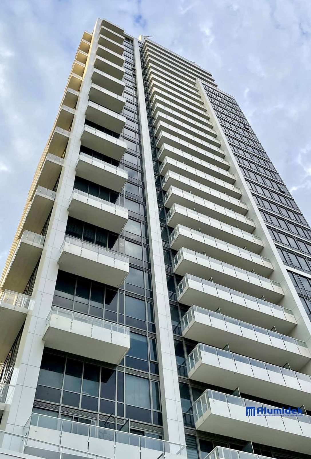 Pour cette réalisation, Alumidek a fourni des garde-corps V225 adaptés aux exigences du design, incluant une main courante plus volumineuse pour une présence visuelle accrue et un meilleur confort. Les panneaux en verre laminé ultraclair comportent un motif en CeraFrit conforme aux normes bird-friendly de Toronto. Des attaches structurelles ont été ajoutées entre les panneaux pour améliorer la rigidité globale et assurer une performance optimale en hauteur.